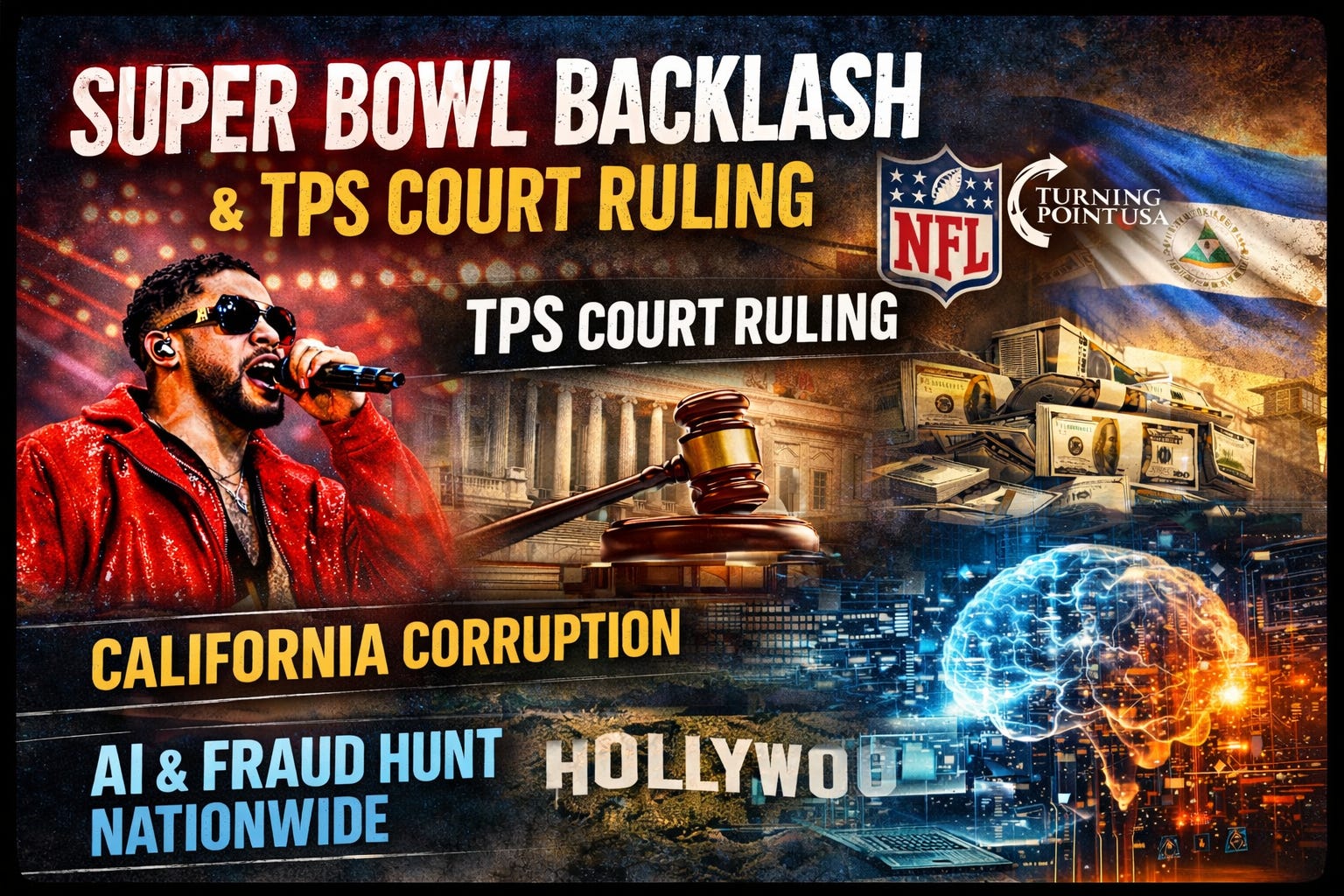Back from California, we opened by tearing into the Super Bowl halftime fiasco—who it catered to, who it sidelined, and why millions reportedly flipped to Turning Point USA’s All-American alternative. Callers tied it to years of the NFL alienating its own fans, then panicking when the ad-buying audience walked. We moved into a major TPS court ruling, how “temporary” protections were stretched beyond recognition, and why that legal scaffolding may finally be cracking. The show closed with California’s hidden money pipelines, scraping a rigged transparency system, and how AI is turning fraud investigations into a nationwide, accelerated operation.