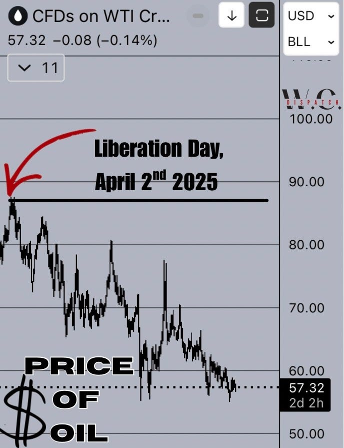 Oil drifting toward $60 does two things at once. It gives American consumers breathing room at the pump. And it tightens the vise on petro-states whose power depends on energy margins, Russia first among them.