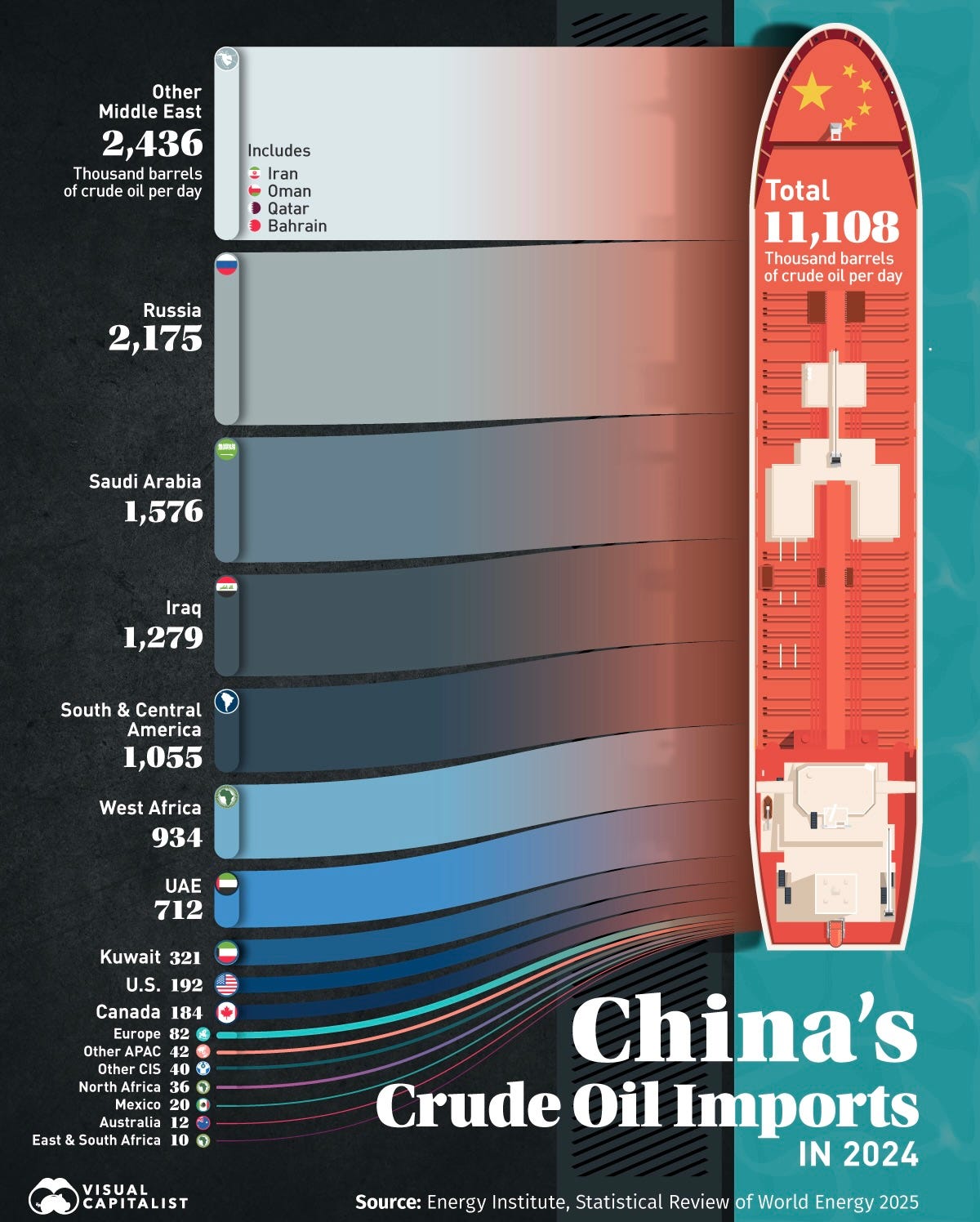 In 2024, China imported roughly 11.1 million barrels of oil per day, with Russia as the top customs-reported supplier at about 2.2 million barrels per day, ahead of Saudi Arabia and Malaysia. That’s not an academic statistic. That is dependency. A supply chain that lives on ships, insurance, settlement systems, and political relationships.