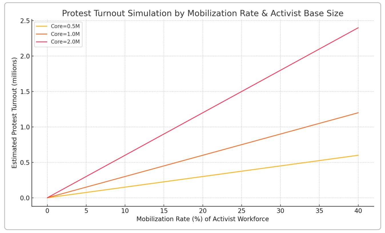 When you plug in conservative assumptions, the numbers line up quickly. With an activist base of roughly one million people, activating just 20 percent and assuming each organizer pulls in two additional participants produces a crowd of about 600,000. Expand that base to two million and activate 30 percent, and you are already near 1.8 million participants. During moments of intense public outrage—when recruiting becomes easier and resistance drops—the totals rise even faster.